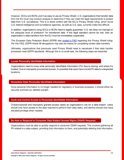 In addition, organizations using SCCs or BCRs need to legally guarantee “U.S. law does not impinge on